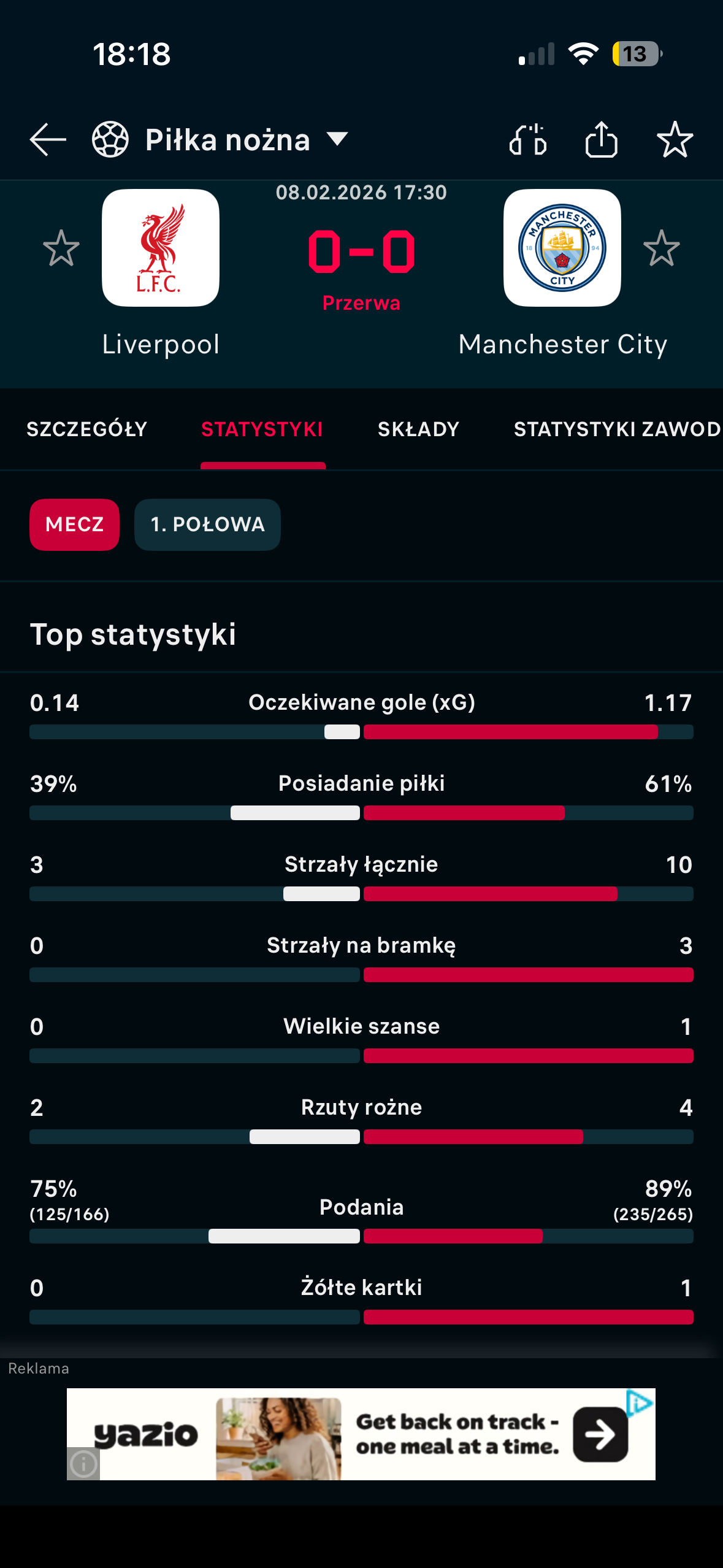Pierwsza połowa zleciała, jak z bicza strzelił. City ma prawdziwe działa w ofensywnie. A u nas niestety Salah i Gakpo pokazują, że na skrzydłach mamy ogromne braki jakościowe.