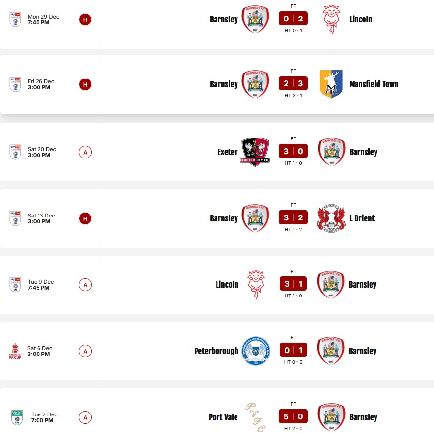 Ostatni mecz Barnsley rozegrali 1 stycznia z Wigan na wyjeździe (1-1). Wcześniej zaliczyli 3 przegrane z rzędu w lidze z Lincoln City (0-2, Mansfield Town (2-3) i Exeter City (3-0).