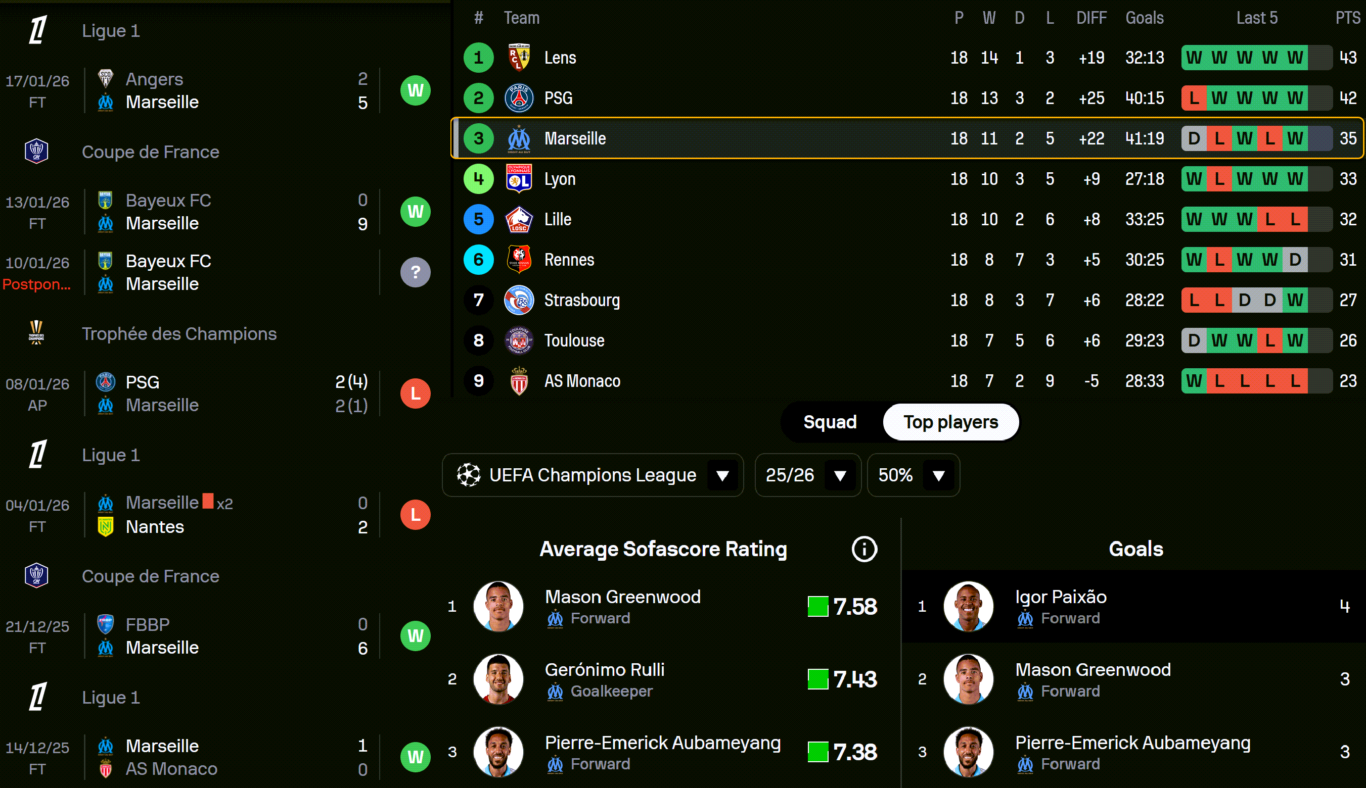 Marsylia w tym roku przegrała tylko raz (1 na 4 mecze) w regulaminowym czasie gry. W ostatnich dwóch meczach strzelili 14 goli. Natomiast były to spotkania z 11-tym w tabeli Angers oraz z grającym w Regionalnej lidze Francuskiej Bayeux FC.