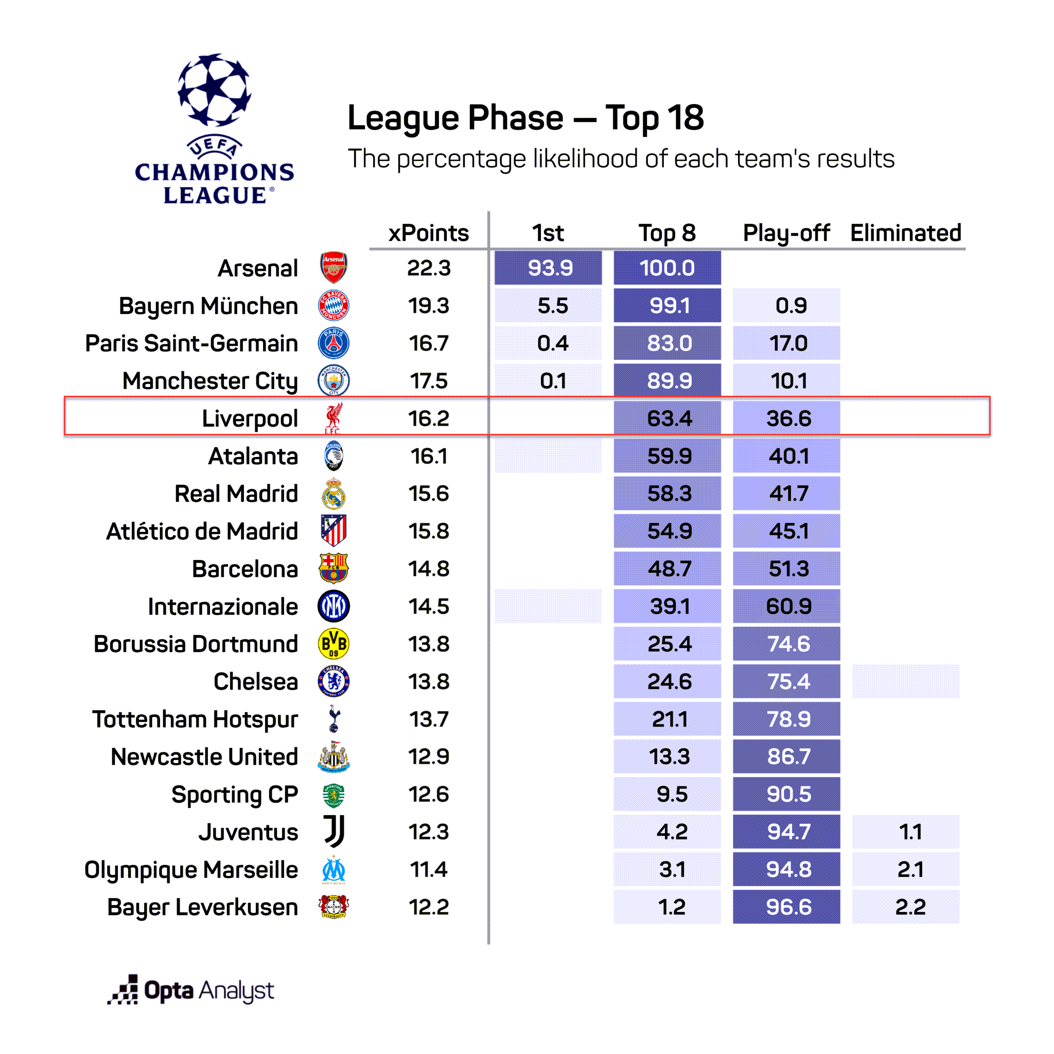 PSG, Man City i Atalanta mają już praktycznie zagwarantowane awansy do kolejnej rundy (poniżej miejsc barażowych nie spadną). Natomiast superkomputer Opta przewiduje 63.4% szans dla LFC na zakwalifikowanie się z pozycji Top8.