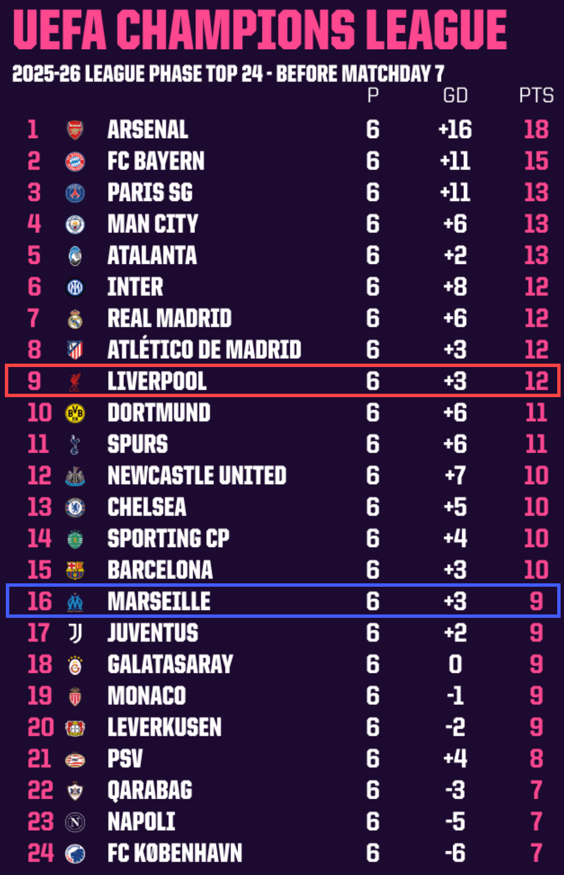 Szacuje się, że mamy szansę na 16,2 pkt na koniec fazy grupowej, co prawdopodobnie oznaczałoby remis w Marsylii i wygraną w ostatnim meczu na Anfield. To bardzo możliwy scenariusz zważywszy na to, że wygrywanie przychodzi nam ostatnio bardzo trudno, jeśli przeciwnik nie pozwoli nam strzelić dwóch bramek z rzędu i wyjść na prowadzenie 2-0… ten niepokojący pattern powtarza się od 30 listopada 2025 od meczu w WHU, a później z Brighton, Spurs, Wolves i ostatnio z Barnsley. Jedynym wyjątkiem od reguły była wygrana 0-1 z Internem na wyjeździe.