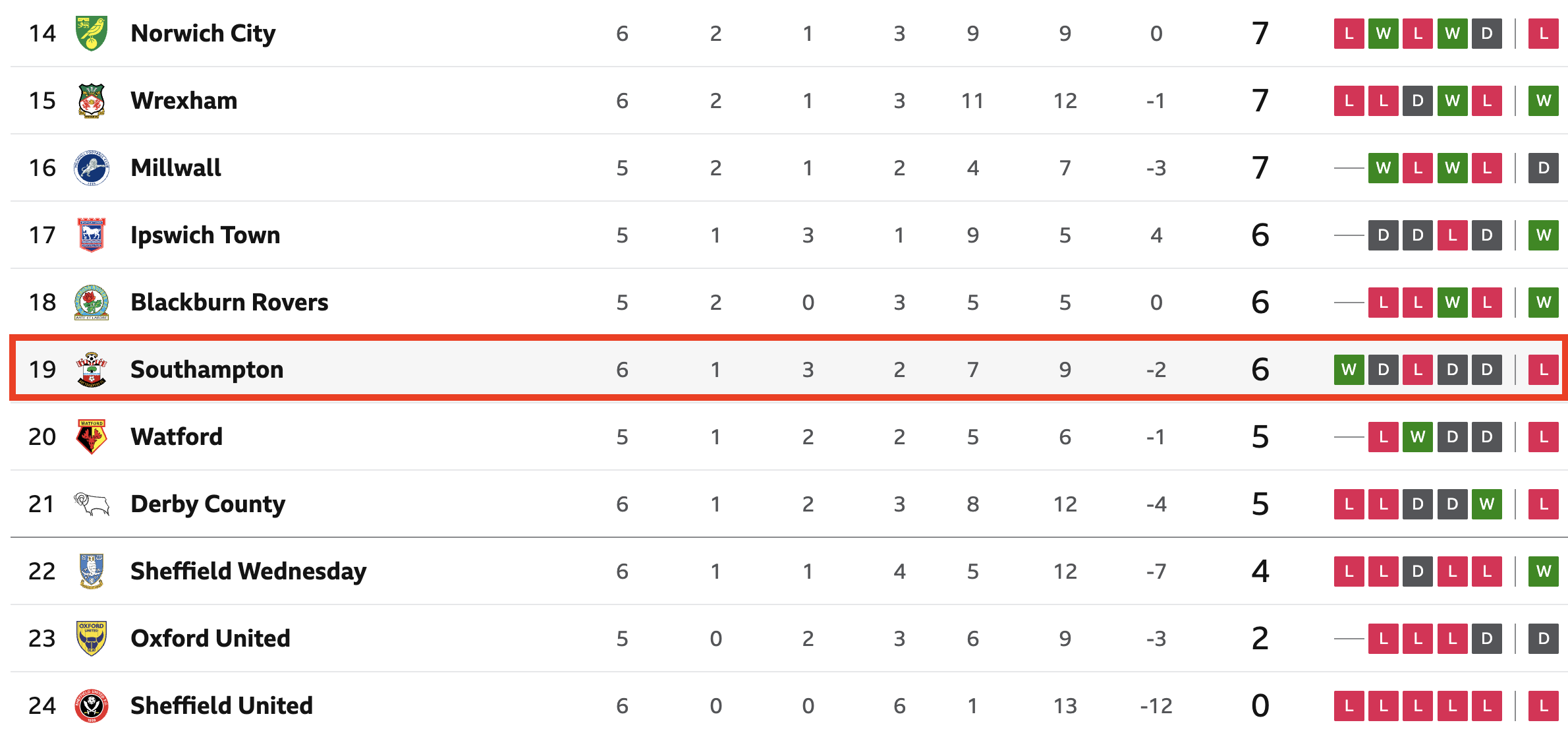 Tabela ligowa Championship po 6. kolejkach wskazuje, że Soton powalczą raczej o miejsca 10-15. O baraże do Premier League może być trudno.
