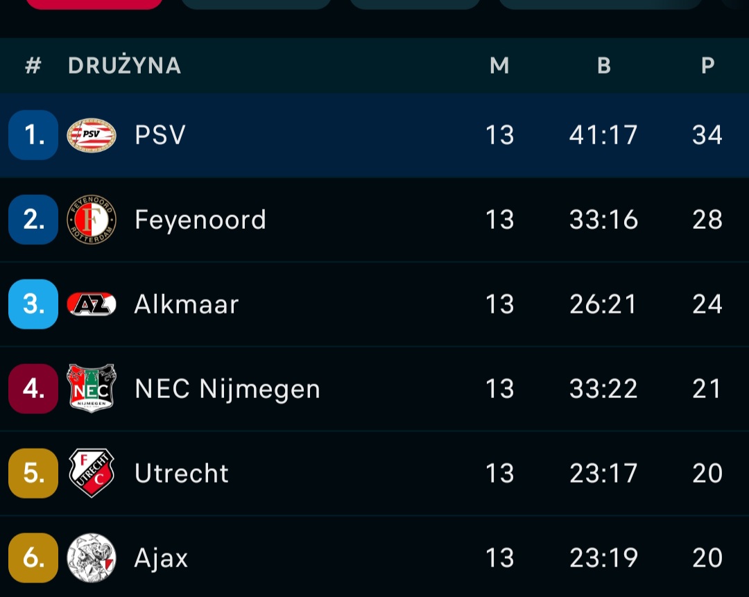 oraz pewne pierwsze miejsce po 13 kolejkach Eredivisie z 6 punktową przewagą nad drugim Feyenoordem.