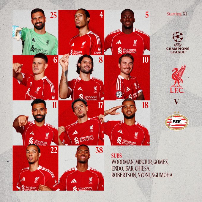 Alisson - Kerkez VvD Konate Szobo - Graven Mac Jones - Gakpo Isak Salah