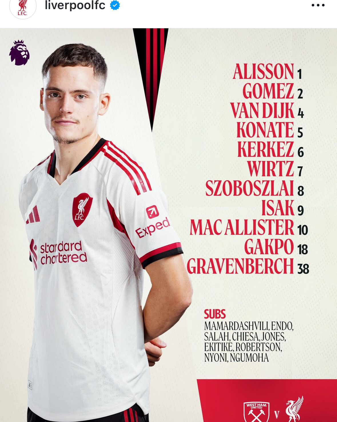 Alisson- Ramsay - Gomez - Virgil - Robbo - Gravenberch - McAlister - Szoboszlai - Wirtz - Ekitike - Chiesa.