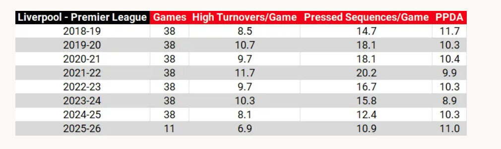 • w poprzednim sezonie i w czasach Kloppa praktycznie wszystkie wskaźniki związane z pressingiem wyglądały lepiej niż w tym sezonie