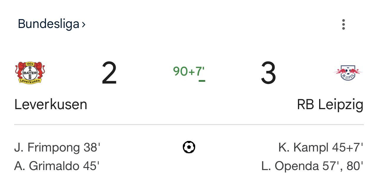 tak jak pisał josif. Leverkusen przegrywa swój mecz pierwszy raz od 35 spotkań. Co daje im 3 miejsce w klasyfikacji. Rekord należy do Bayernu 53 mecze.