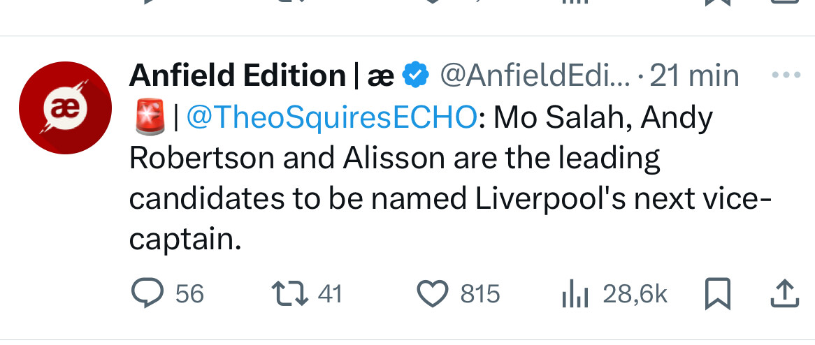 Co do vice kapitana to też bym obstawiał któregoś z tej trójki. Naturalnym wydaje się Robbo, ale on będzie najprawdopodobniej grzał ławę. Co do Aliego to wydaje mi się, że Slot kiedyś mówił, że jest sceptyczny z bramkarzami w roli kapitanów, bo słabo czują mecz. Więc zostaje Mo i to on pewnie najczęściej będzie wychodził z opaską pod nieobecność VVD.