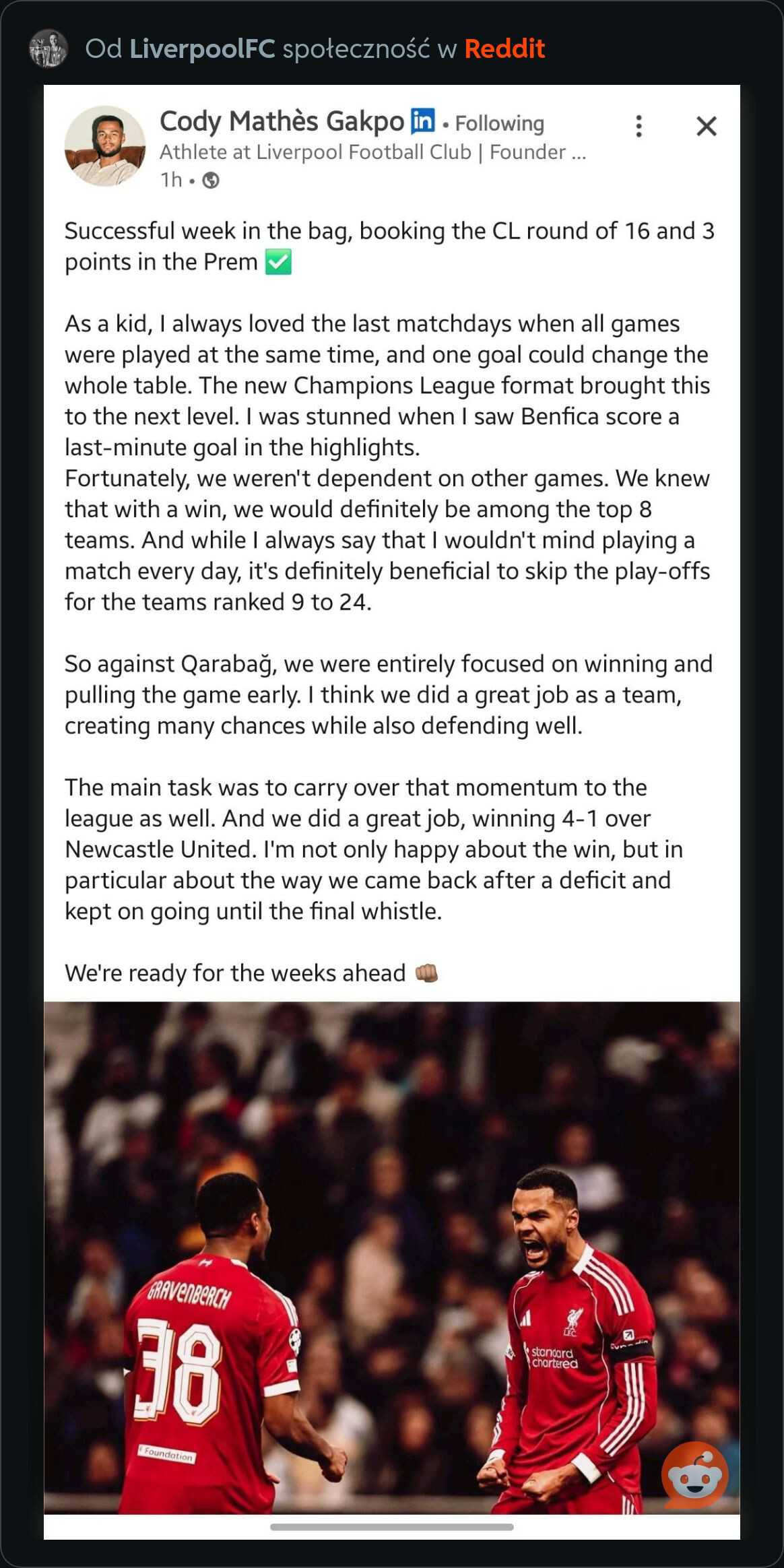 Gakpo grał beznadziejnie, ale Rio też dał zmianę skandal. Mi się wydaje że slot próbuje odbudować codyego i salaha.