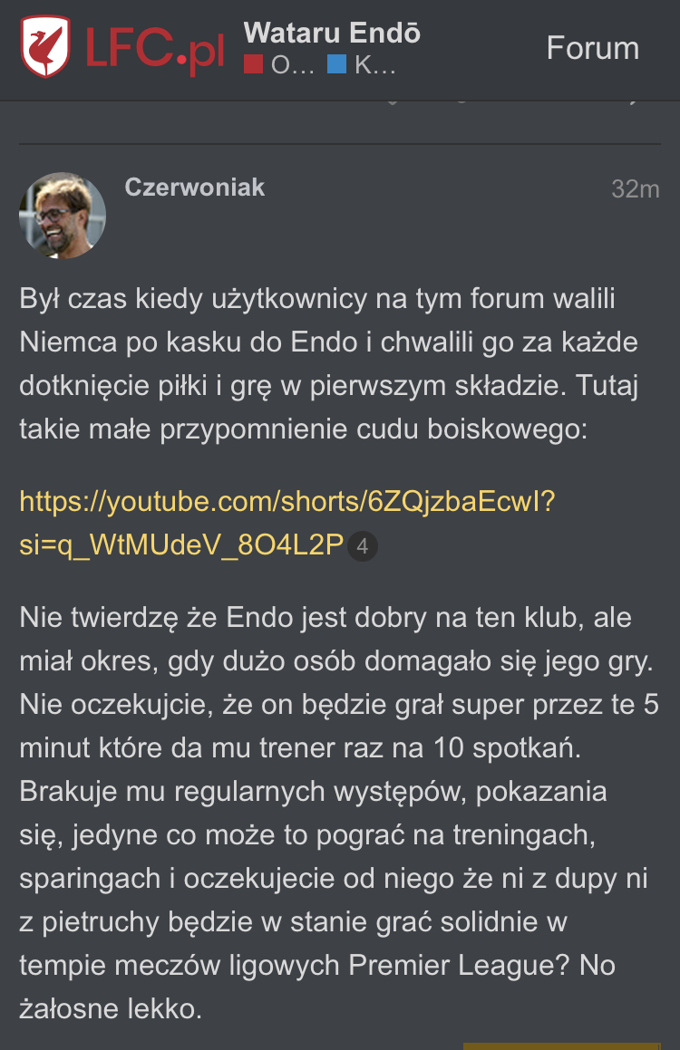 Już mieliśmy takiego jednego “nie zaangażowanego” w mecze piłkarza, również wychowanka co chieliście go wywozić na taczkach. Chłop był tak beznadziejny, że jednym zagraniem potrafił przechylić losy meczu na naszą stronę (czego nomen omen teraz często nam brakuje). Za to Wataru Endo to jest piłkarz xD bo dużo biega i ma ochraniacz na zębach. Tylko Slot się na niego uwziął