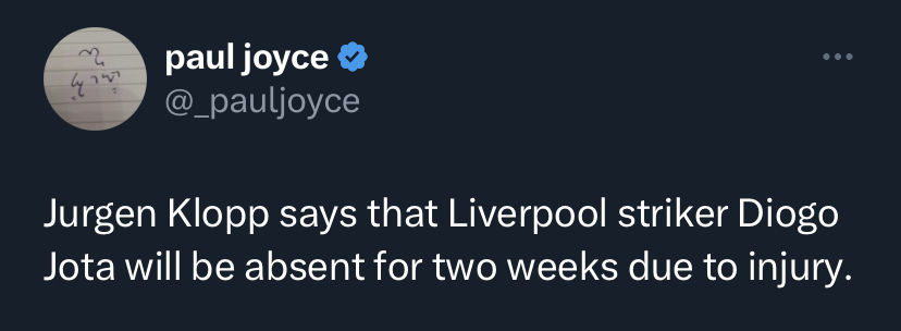 W temacie o Salahu pisałem, że na Everton powinniśmy wyjść z tercetem Gakpo, Salah, Diaz. Jote szykowałem na wejście z ławki, ale nawet takie chuchanie i dmuchanie to za mało. Raczej bym mu dał jeszcze rok, może u nowego trenera z nowymi metodami treningowymi jego zdrowie będzie wyglądać inaczej?