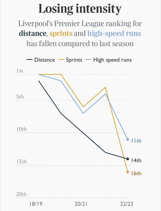 Te statystyki z wykresu wyglądają bardzo niepokojąco, o ile dystans można zrozumieć, skoro mamy bardzo wysokie posiadanie piłki, o tyle pozostałe dwie świadczą o zapaści formy fizycznej.