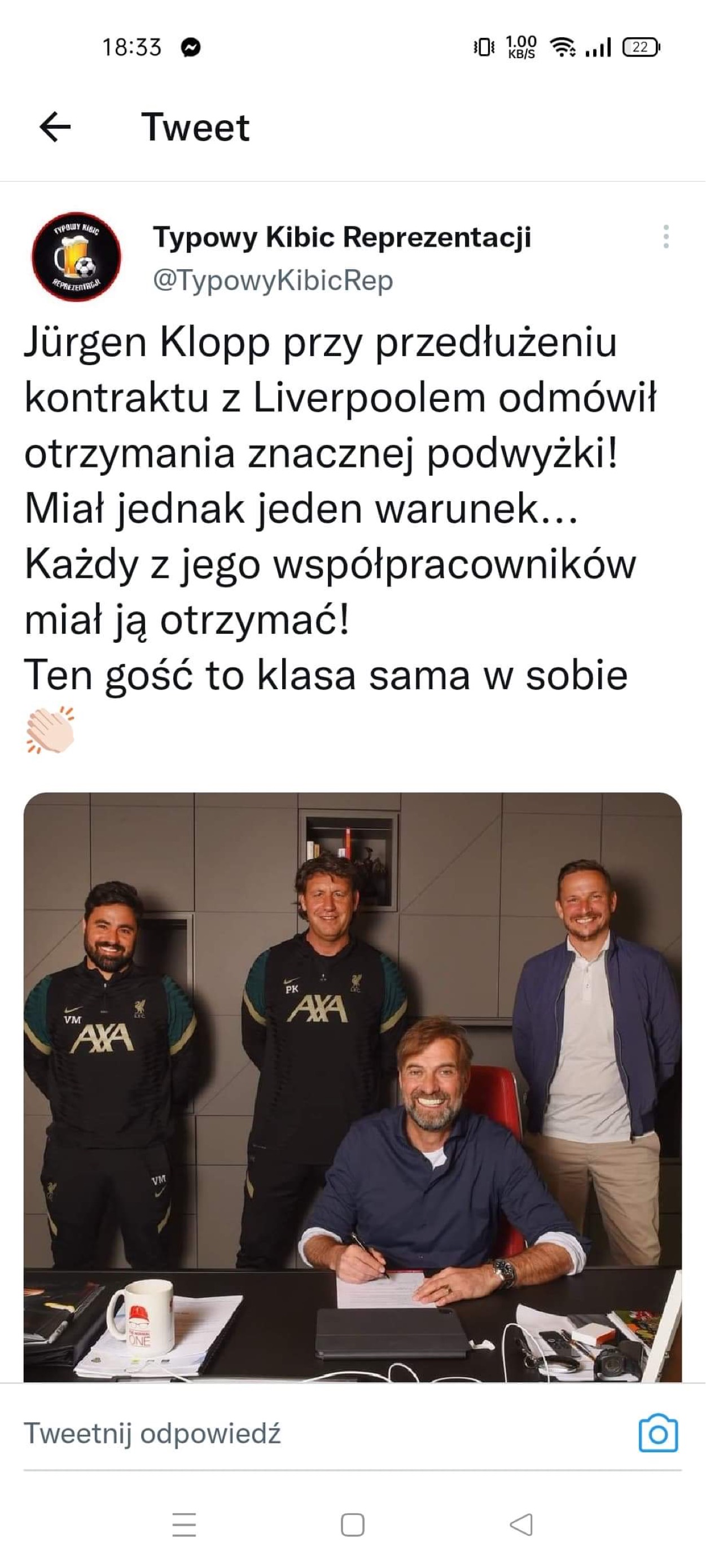 Piękna sprawa, cudownie, wspaniale, nawet nie widzę szkoleniowca, który wizją i pomysłem gry zbliżyłby się do Kloppa. Wspaniała wiadomość, nie jest jeszcze jakiś mocno stary, jak dla mnie niech siedzi i kolejne 10 lat, dziękujemy Ulli i Jürgen.