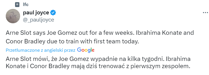 Dobre informacje, bo Chiesa i Jota trenują normalnie, także mogą być w kadrze meczowej na Fulham, Konate ma szansę na powrót do gry jeszcze w grudniu, a Tsimikas już trenuje indywidualnie także też może będzie brany pod uwagę pod koniec grudnia, oby tylko nie było więcej urazów!