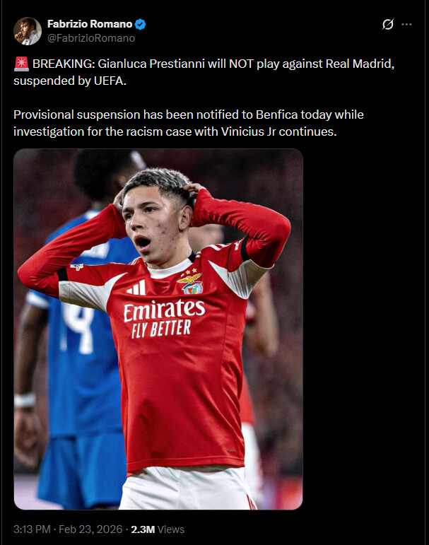 Absolutnie skandaliczna decyzja UEFA, zawieszenie zawodnika bez żadnych dowodów winy, gdzie oskarżający Vinicius jest znanym prowokatorem i nie można brac jego słów na poważnie.