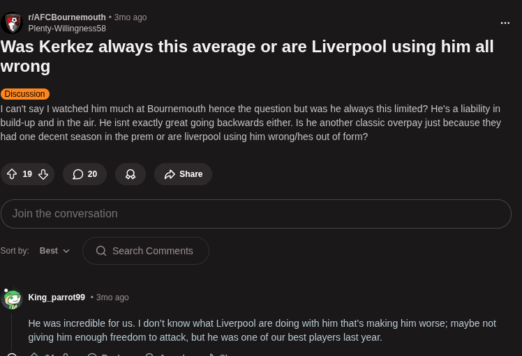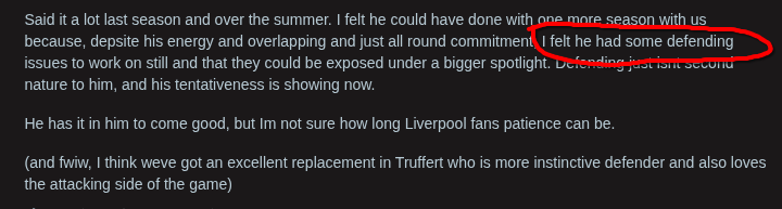 A ja uważam, że może być lepszy w ofensywie tylko trzeba kogoś kto weźmie go na stronę i wbije mu parę rzeczy do głowy. Robertson też był zły na Kloppa bo Niemiec stawiał na Moreno i mówił mu, że jest bardzo niezadowolony z niektórych aspektów jego gry co zaskutkowało tym, że Szkot po połowie roku wszedł na światowy poziom. I tego mi brakuje, Kerkez może jest świadom tego, że prezentuje się średnio ale i tak ma pewny skład i nikt też chyba nie mówi mu żeby zaczął robić niektóre rzeczy inaczej więc on będzie nadrabiał tym, że będzie biegał jak kurczak bez głowy będzie się rzucał na piłkę będzie biegł w ciemno choćby go kopali. Dla mnie on jest źle prowadzony, można wyciągnąć z niego o wiele więcej tak jak z resztą od każdego innego nowego zawodnika, po prostu na Kerkezie to najbardziej widać bo jest chyba piłkarsko najmniej inteligentny.