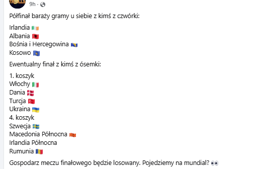 Podsumowując jak dostaniemy Kosowo to nie zdziwię się jak wylecimy już po półfinale. Jeśli jednak awansujemy to i tak każda repra z 1 koszyka jest silniejsza, włącznie z Ukrainą + nie zagramy u siebie.