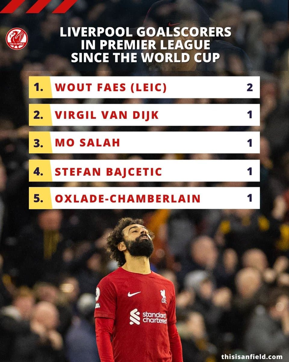 Liverpool nie strzelił gola w Premier League od ponad 310 minut. W 6 meczach ligowych od powrotu po mundialu The Reds strzelili zaledwie 6 bramek – dwie z nich zdobył Wout Faes z Leicester.