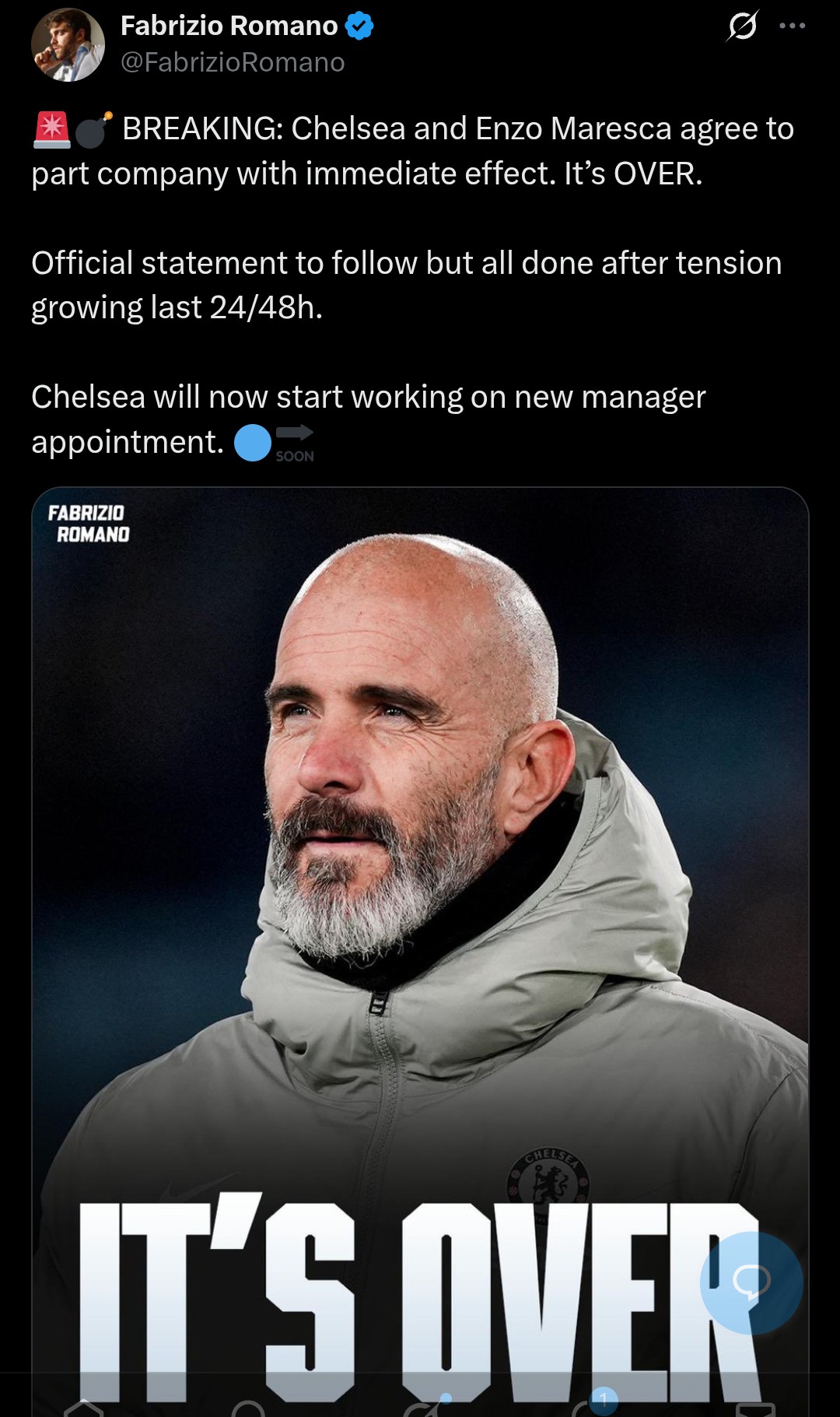 W mediach ptaszki ćwierkają, że Maresca jest na wylocie z Chelsea i to może się stać nawet dzisiaj. Dla mnie to jest klub mem, co roku sà ogromne przetasowania kadrowe, naściągali mu samych młodych utalentowanych piłkarzy, ale chyba zapomnieli że samą młodzież bez wsparcia doświadczonych zawodników tego nie udźwignie.