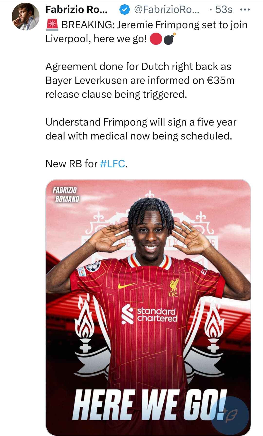 🎖️ | @_pauljoyce — Liverpool will formally trigger the £30 million release clause for Jeremie Frimpong.