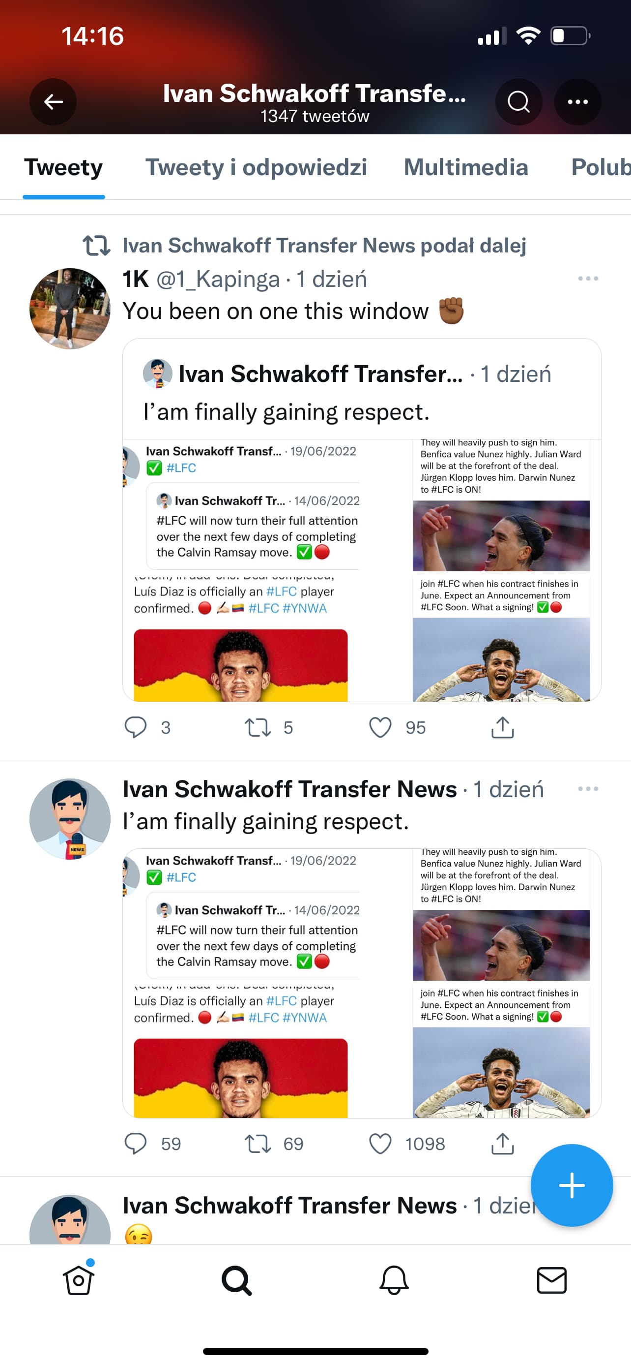 Polecam dobrze prześledzić jego posty, ja teraz się cofnąłem do Salaha i już w czwartek pisał o przedłużeniu umowy. Danjumy pisał ze biliśmy blisko ale wybraliśmy finalnie Diaza