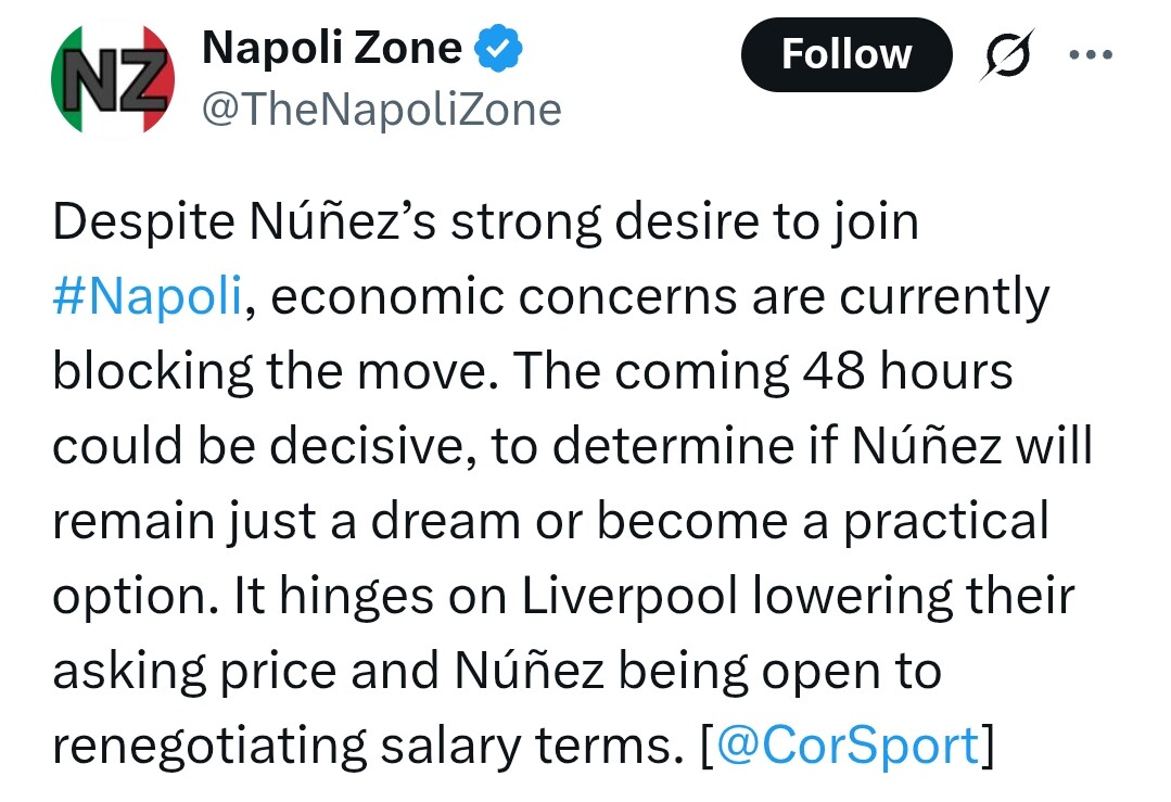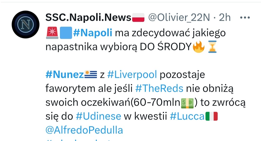 Nunez, musisz… jeśli on zostanie, to się załamię. Za rok nie dostaniemy nawet zbliżonej sumy do tej, co teraz pewnie Napoli oferuje, no chyba że zmieni zdanie nt Arabii.