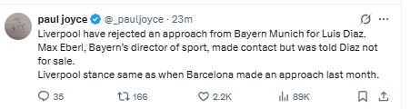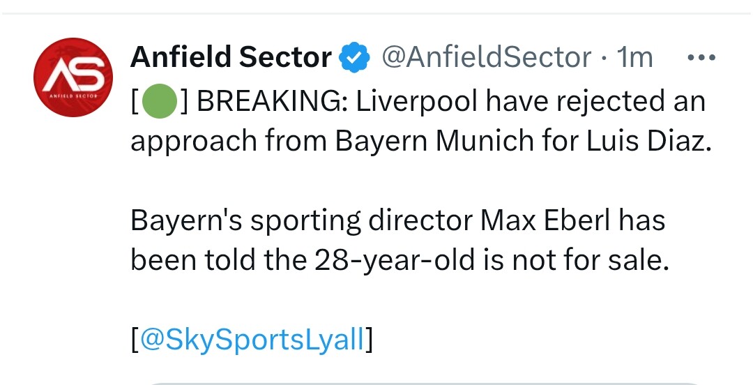 Po prostu Diaz jest ceniony przez klub. I myślę że tylko szalona oferta w okolicach 100m mogła by nas skusić. Ewidentnie widać że nie mamy zamiaru się osłabić. Kolejna kwestia jest to że zalezy nam na pozbyciu się nuneza. Jesli wycena Frankfurtu i Newcastle będzie dalej tak szalona to mimo wszystko Diaz jako tako dawał tam radę i lepiej go mieć niż Darwina