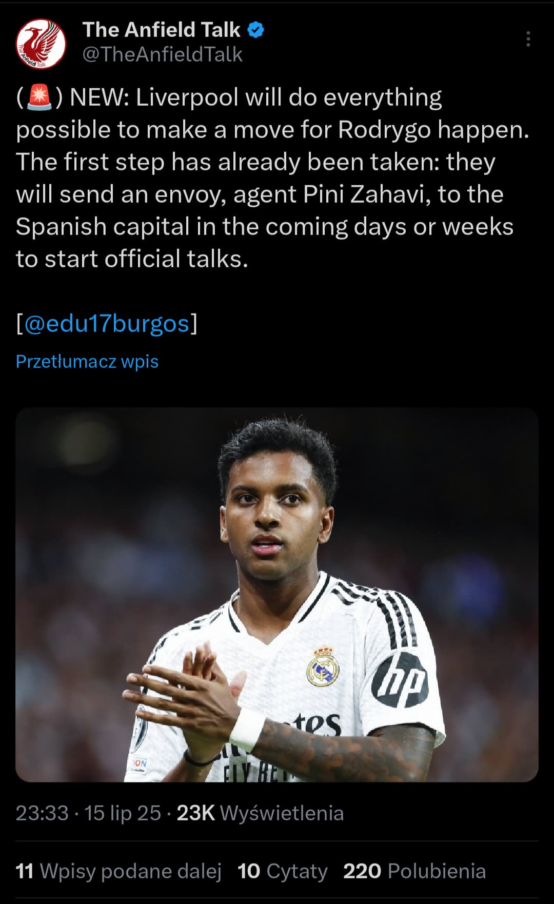 W transfer Isaka jestem w stanie uwierzyć. Ale w Rodrygo nie. Liverpool stara się dobierać piłkarzy odpowiednich pod względem charakteru. Wątpię żebyśmy chcieli gwiazdkę z Realu. Brazylijczycy bywają rozkapryszeni. Złotozęby Rodrygo nie wróży dobrej aklimatyzacji w zespole