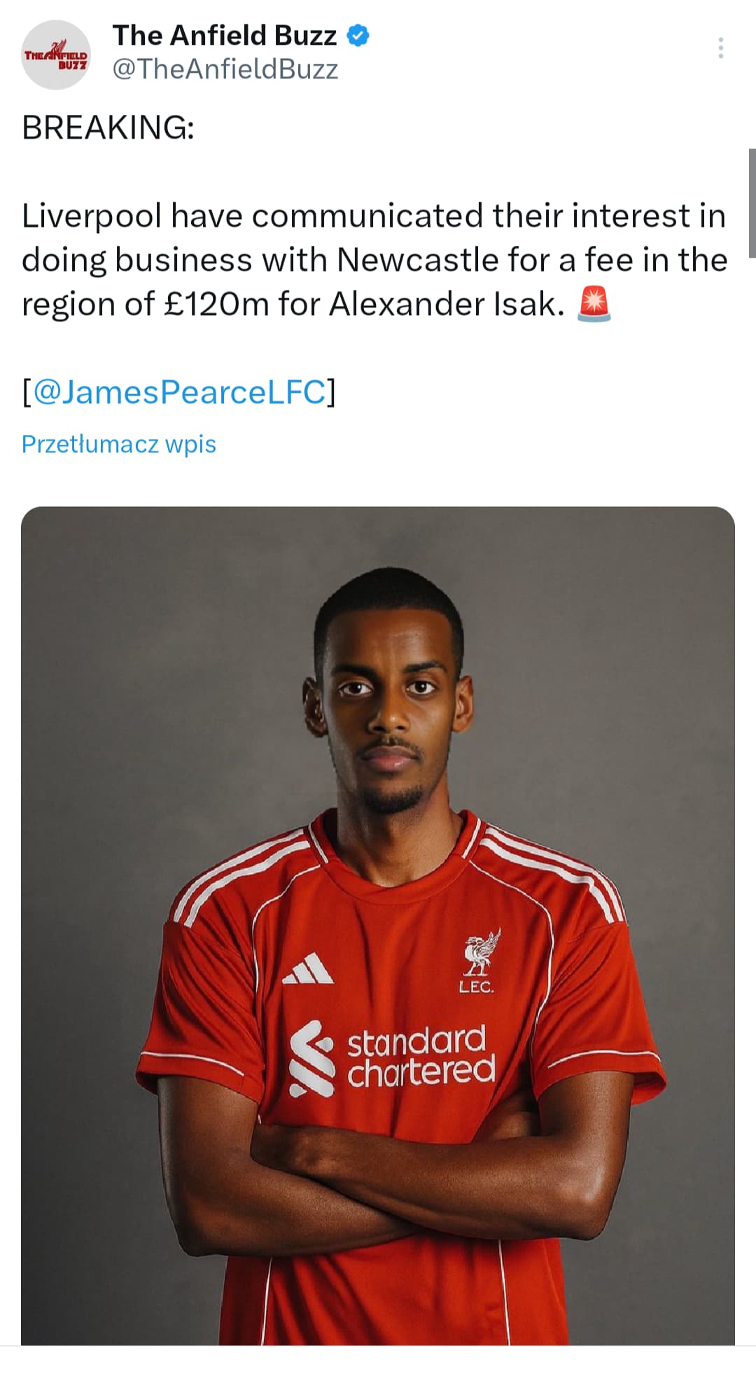 "The Times" korespondent piłkarski Martin Hardy pisze, że Newcastle “zadzwoni do oficjalnej oferty” o wartości “w regionie 130 milionów funtów”.