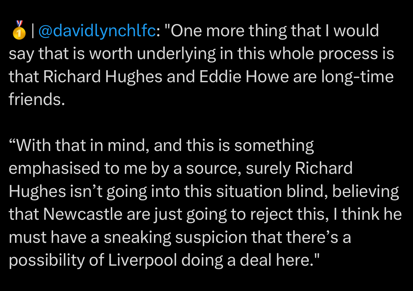 @el_pistolero ok, Ale to dla mnie brzmi trochę jakby hughes był jakims guru. No bo przecież Frankfurt może zgodzić się na obie oferty. I ekitike może wybrać tę od srok skoro dla nas od początku jest tylko alternatywa. Druga sprawa że to może Newcastle nas właśnie prowokuje żebyśmy wzięli ekitike i zostawili im isaka. Przecież dla nich wariant zostawienie isaka a ekitike do lfc jest lepszy niż isak do lfc a ekitike do srok. A jeśli tak poważny kandydat odpadnie z wyścigu o Szweda (no bo jak za około 70-80 kupimy młodego francuza) to po dobrym sezonie isak może uznać że przedłuża kontrakt.