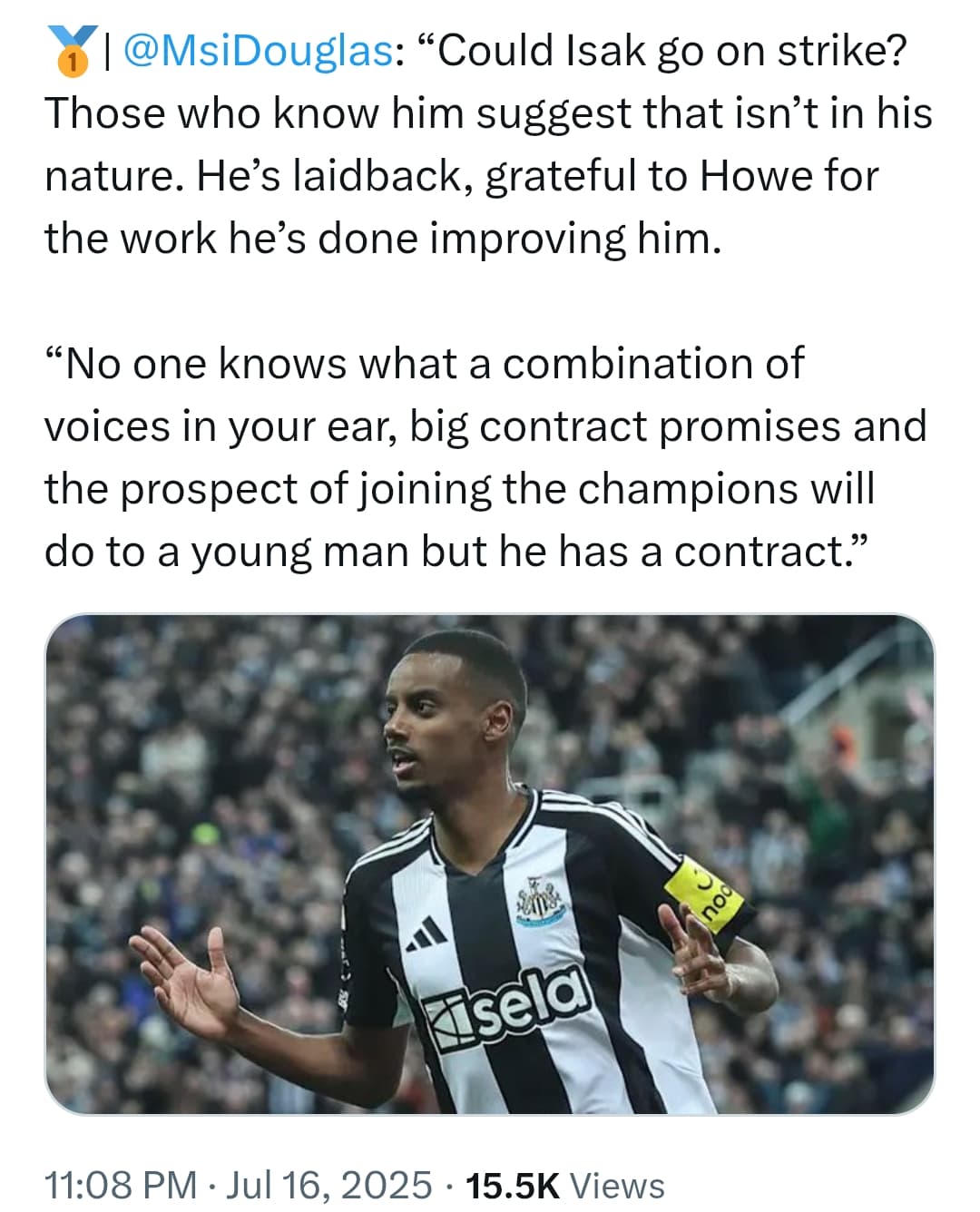 Gdzieś chyba tutaj było, lub widziałem gdzie indziej, że Isak odrzucił nowy kontrakt z £205tys tygodniówki. Jeśli to prawda to zapewne klub wie, że wolałby odejść.