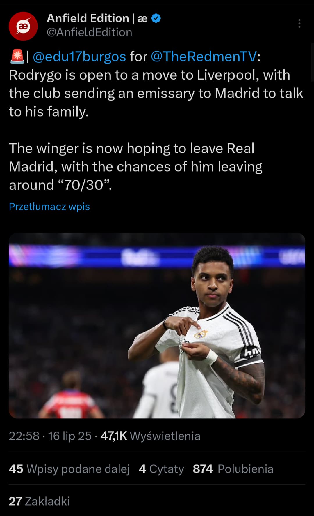 A propo Rodrygo to jego odejscie nie jest pewne. Vinicius żąda najwyzszej pensji w klubie, 30 milionow netto, sprawa kontraktu sie przeciąga. Jeszcze to jego odpalą a nie Rodrygo.