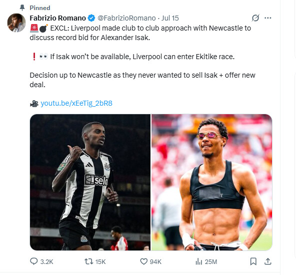 Hmm, ale czy to nie jest tak, że Newcastle chce Ekitike w razie odejścia Isaka? Być może dopuszczają możliwość wypuszczeniq Szweda, ale muszą kupić Ekitike w jego miejsce. Zawiłe to wszystko, ale to wszystko pokazuje, że mamy szanse na Isaka i trzeba czekać.