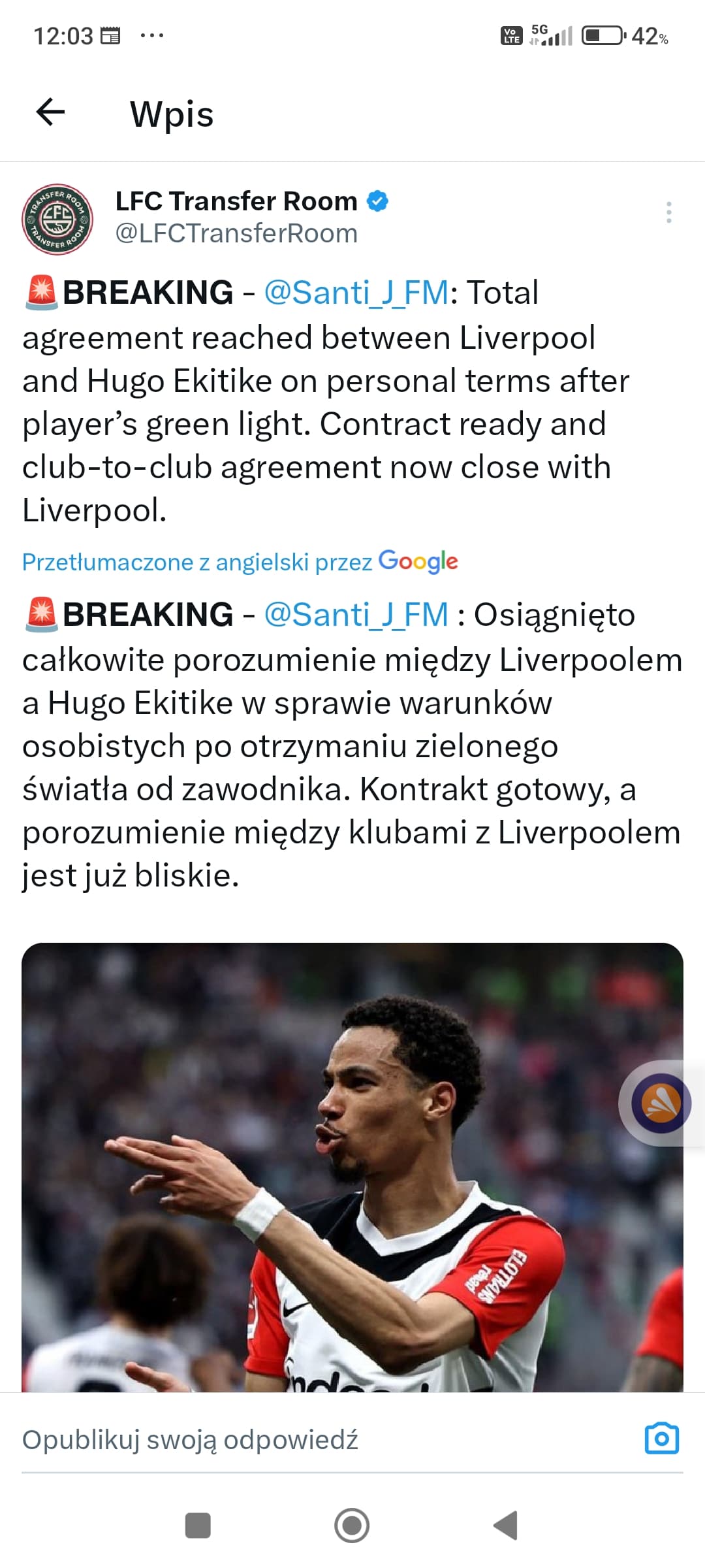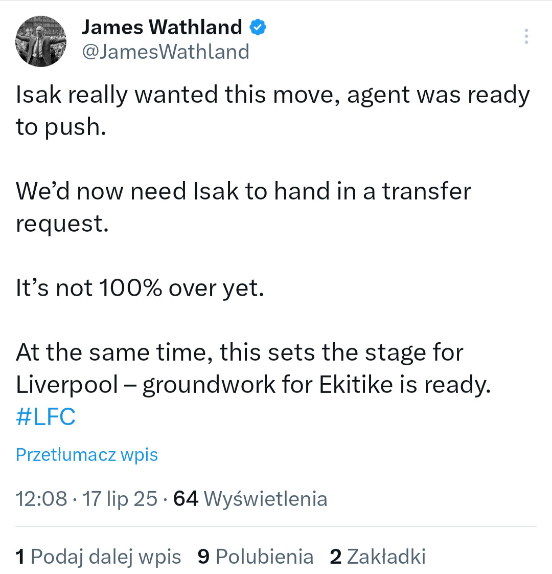 Z tych wszystkich doniesień transferowych jasno wynika, że celem numer 1 był/jest Alexander Isak, a celem numer 2 - Hugo Ekitike, ale nie na zasadzie, że ten Ekitike byłby dla nas “nagrodą pocieszenia”, a wręcz przeciwnie - on jest bardzo dobrze prześwietlonym graczem przez nasz dział rekrutacyjny i od początku jego kandydatura była/jest traktowana jak najbardziej poważnie w kontekście dopasowania do naszego stylu gry i naszego składu.