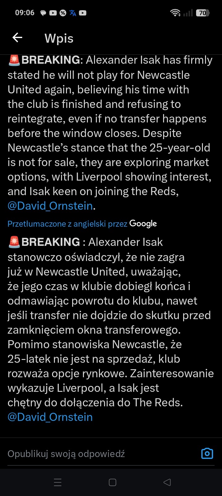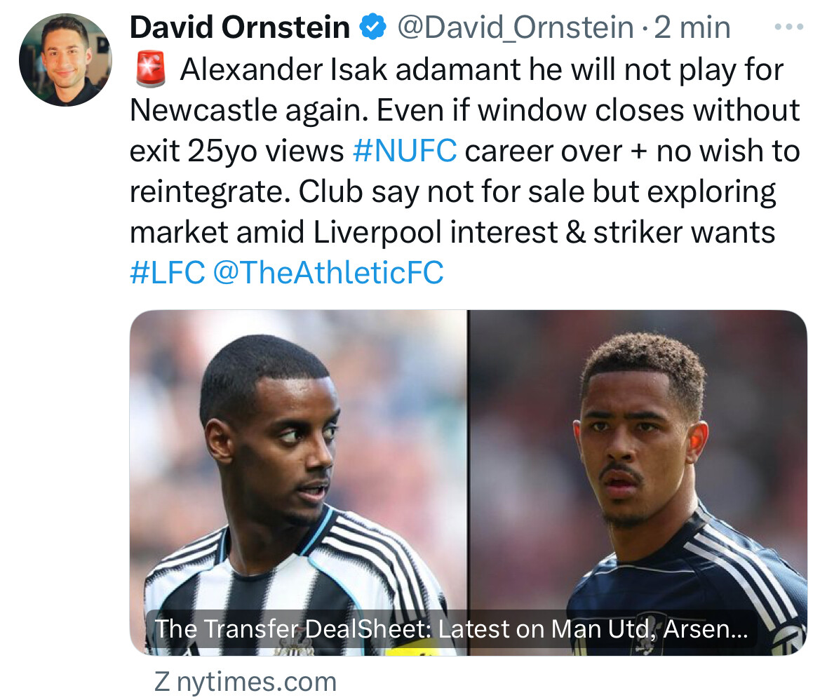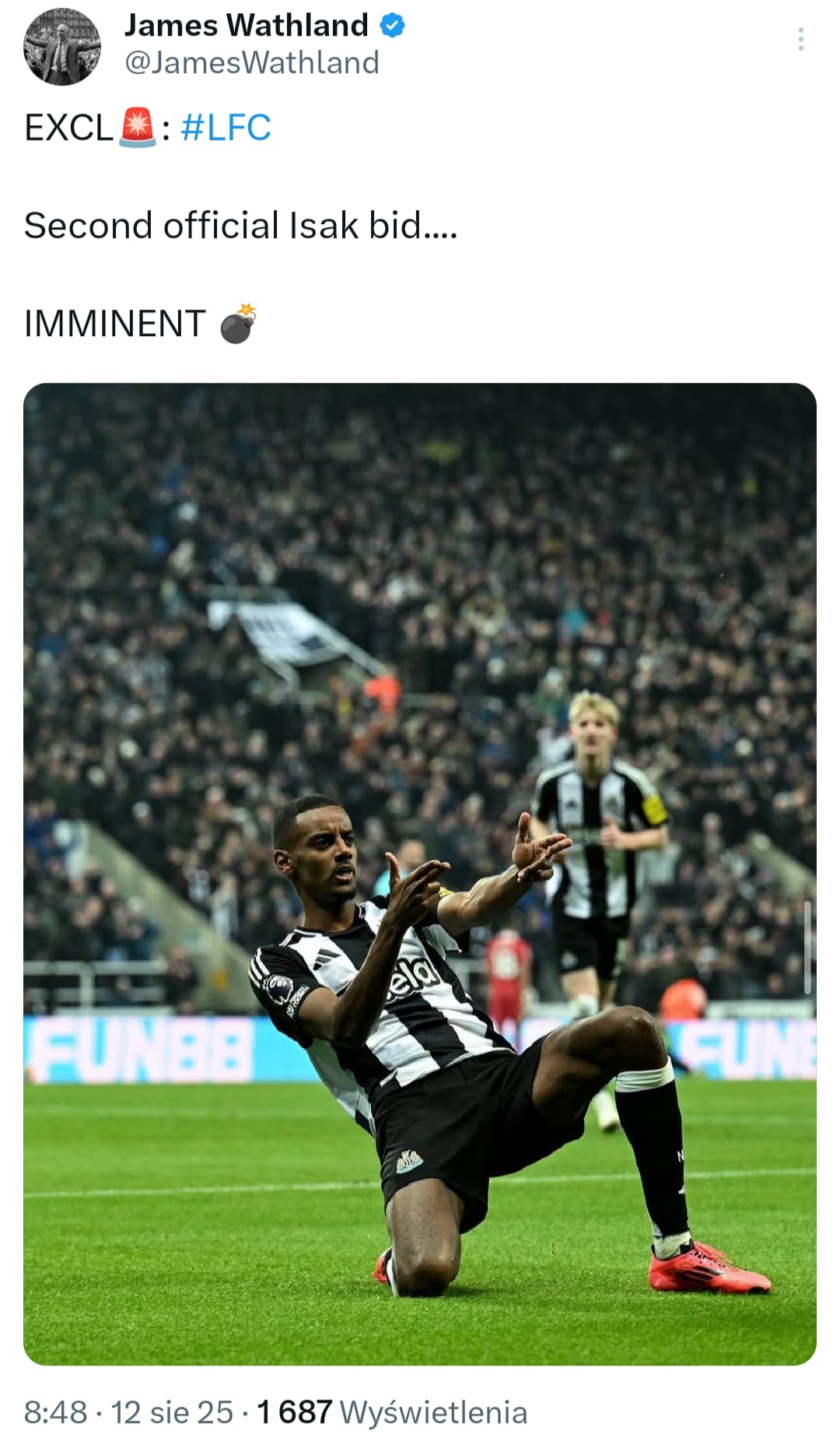 Po takim newsie Ornsteina ciężko uwierzyć żeby Isak zagrał jeszcze dla Newcastle. Mosty zostały spalone. Kibice na St. James Park by go “zjedli”, a koledzy z drużyny też zapewne maja go dość. Niech Newcastle kupuje Wisse, Jacksona czy kogokolwiek i czas kończy tą sage.