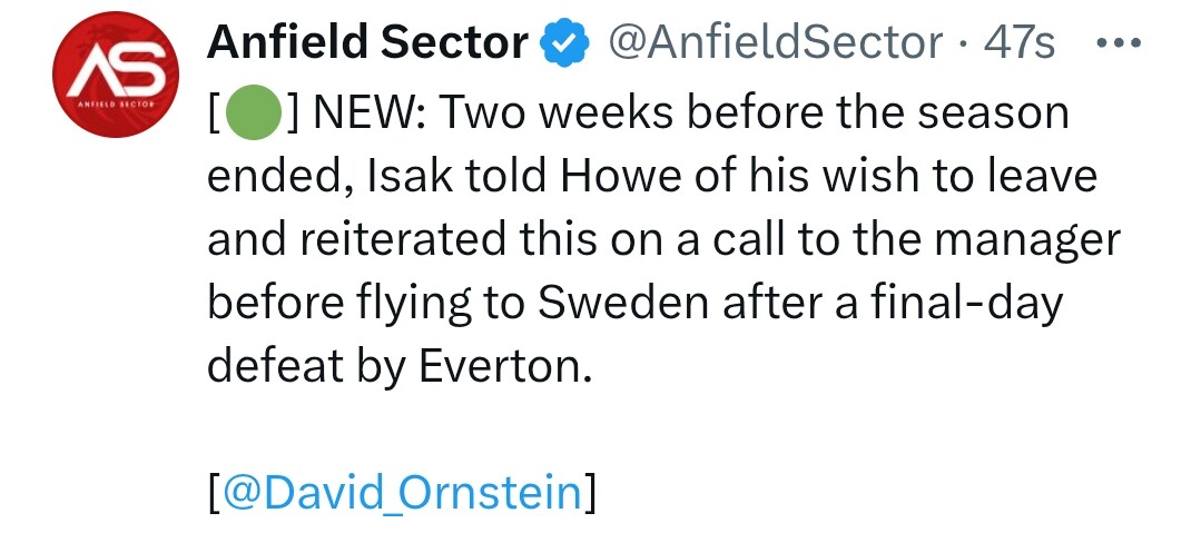 Ornstein napisał, że Isak już przed końcem tamtego sezonu zakomunikował, że chce odejść.