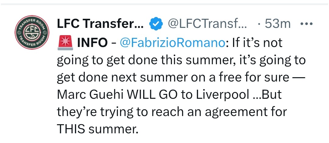 Podpisać Konate, wlatuje Guehi i Leoni i pozycję CB mamy odpowiednio obsadzoną. Poza tym mam nadzieję, że Guehi zostanie “spróbowany” na 6 w rotacji do Gravena gdy VvD i Konate będą nie do wygryzienia, bo Endo to jest super walczak, ale na ‘wygrane’ mecze do wejścia z ławki. Guehi i opcjonalnie Macca na 6 to byłaby już fajna opcja do odciążenia Gravena (tyle, że Argentyńczyk też musi dostawać częściej odpoczynek, na szczęście Szobo na ten moment może mu to zapewnić ze względu na Wirtza). Coś ktoś tu spamił o Balebie, ale oni od MU chcą prawie 100mln funtów, więc pewnie zwykłe ploty (zwłaszcza, że zbliżony profil do Gravena to ma Zubimendi /wiem, że nieaktualny/ czy Stiller, a Baleba to bliżej do Fabinho).