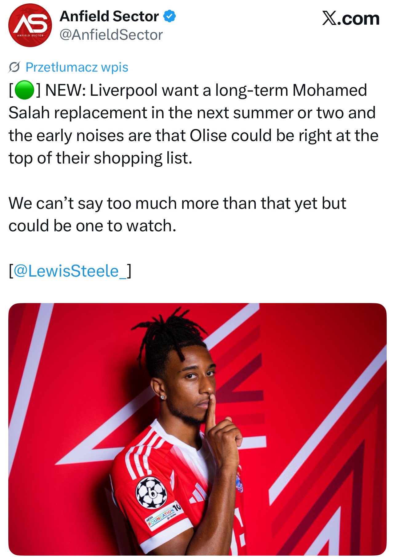 W przyszłe lato żegnamy gasnącego w oczach Salaha i idziemy po Olise. Francuz nie będzie zdolny odmówić potędze Liverpoolu i szybo do nas dołączy.