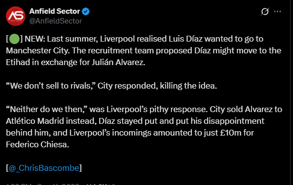 Chris Bascombe informuje, że rok temu Diaz chciał odejść do City. Liverpool zaproponował wymianę za Alvareza, jednak City poinformowało że nie zamierza go sprzedawać do swojego rywala ligowego. Wtedy również Liverpool uznał, że nie sprzeda Diaza do swojego rywala.