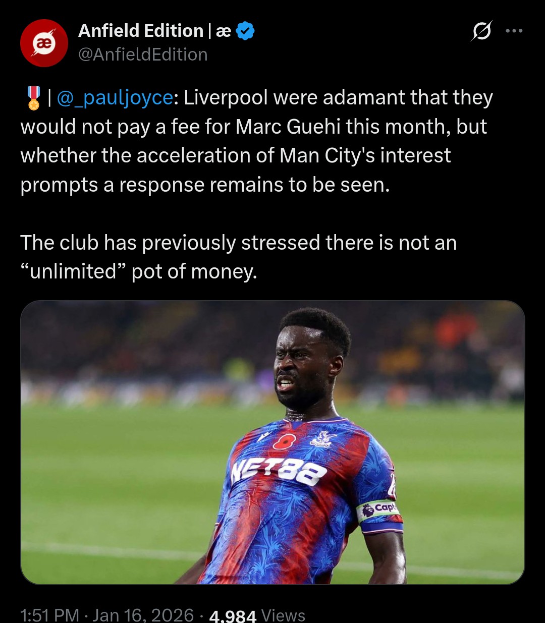 Jeśli rzekomo byliśmy zdecydowani dać 30-35M latem to 1 stycznia Guehi powinien być ogłoszony jako zawodnik LFC. I tak mielismy tyle za niego położyć. Realnie wartość rynkowa Guehi to jakieś 70M jak nie lepiej.