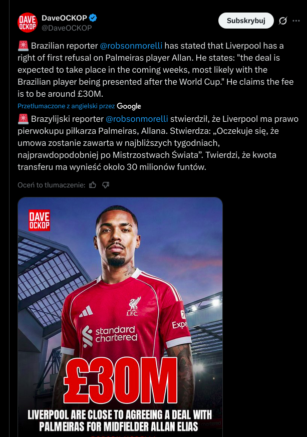 Długo myślałem skąd kojarzę brazylijskiego Allana w Liverpoolu, a później sobie przypomniałem, że już mieliśmy tu takiego gagatka. Też wielki talent, a skończył niewiadomo gdzie.