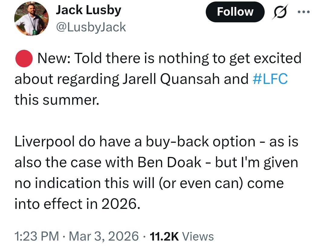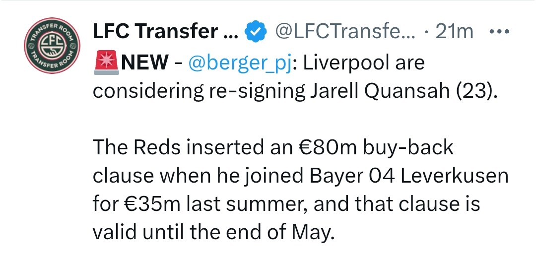 Ludzie bądźmy poważni. Ruszyliśmy po JJ. Na rynku będzie najlepszy obrońca bundesligi Schlotterbeck i do tego lewonożny. Mówi się że bastoni może będzie chciał odejść z Interu, a my pójdziemy po Quansah który gra po prostu solidnie w Leverkusen. Niech się mu wiedzie ale lfc to za wysokie progi