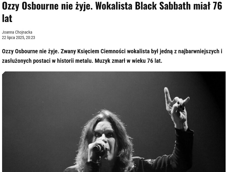 Wielka szkoda … pamiętam jak bodaj 6 lat temu byłem w Krakowie na jego koncercie już wówczas widać było że to starszy Pan ale koncert był mega, Black Sabbath to jeden z moich ulubionych zespołów czy to z Ozzym czy nie na vocalu RIP
