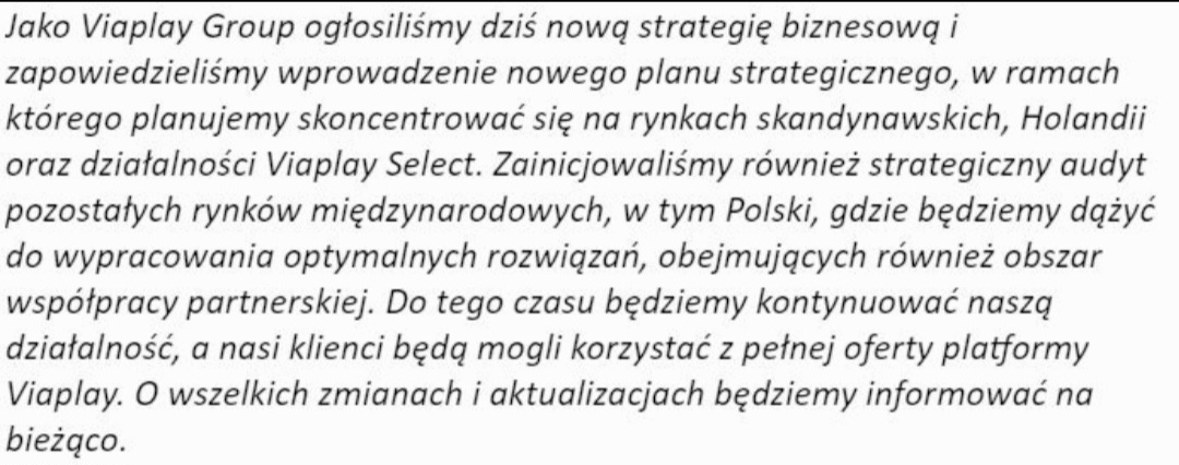 Wątpię, żeby nagle użytkownicy w Polsce stracili możliwość oglądania transmisji. Model jaki będzie miało Viaplay po wyjściu z Polski bedzie polegał na sprzedaży praw do transmisji. Zapewne będzie to w ten sposób rozwiązane i mam nadzieję, że PL i F1 trafi w jedno miejsce, abym znów nie musiał kombinować z oglądaniem obu sportów